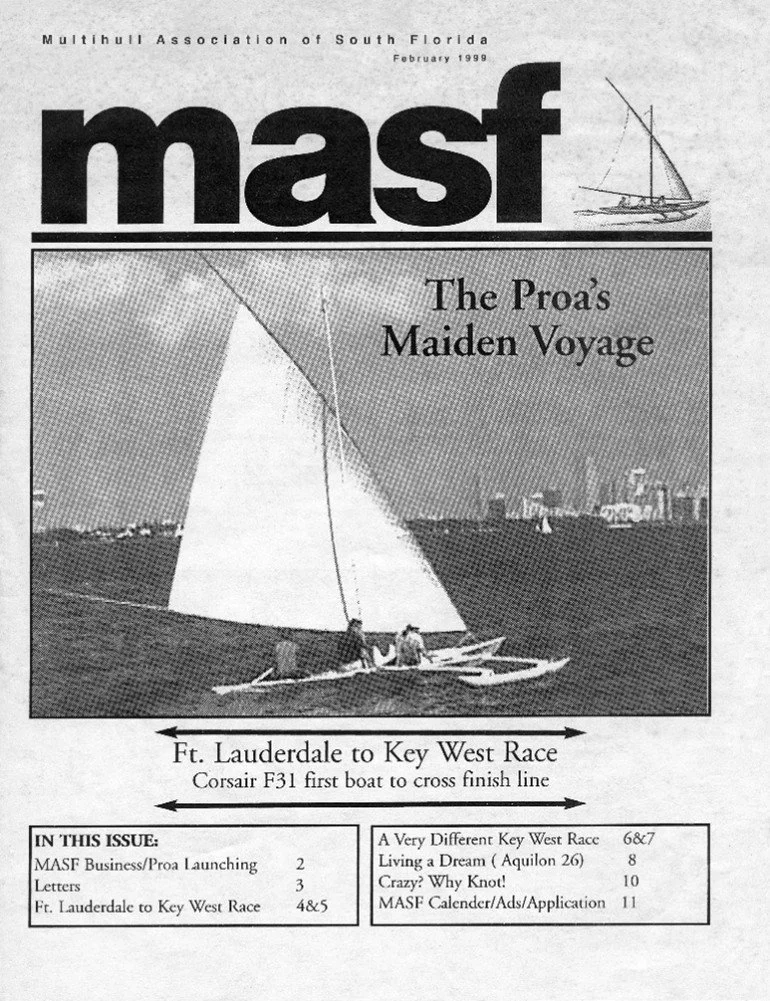 Figure 3. Cover page of the Multi-Hull Association of South Florida Newsletter (February 1999). The photo is of the Flying Proa II in action for the first time being sailed by Dr. John Van Leer, Sam Van Leer, and Dennis Finkman. Photo courtesy of Dr. John Van Leer.