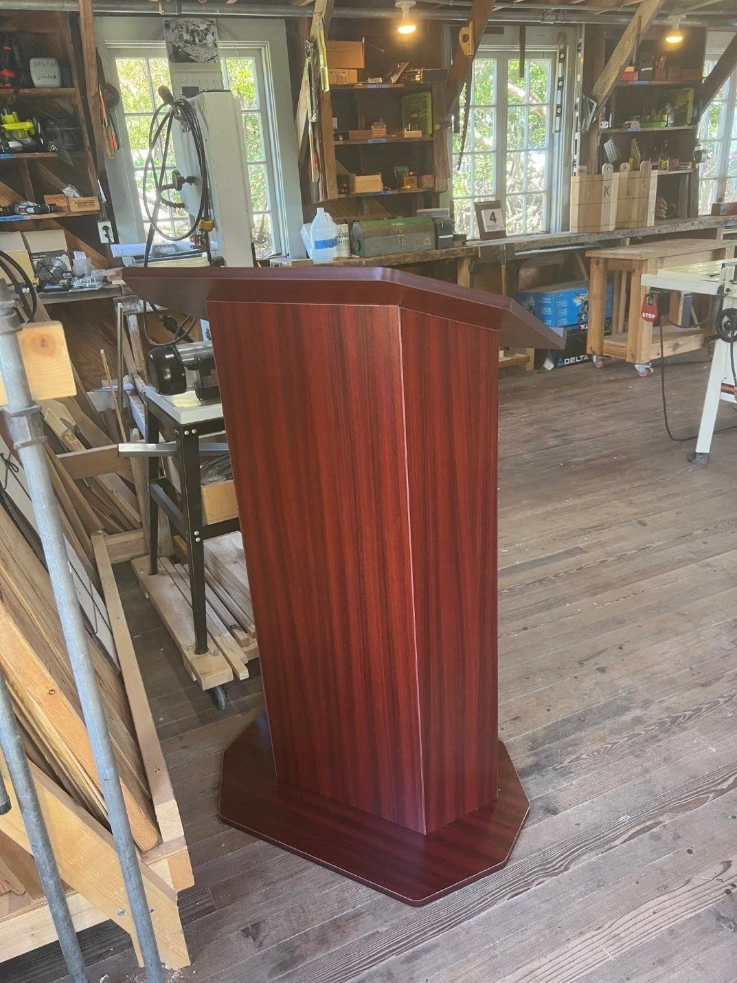 Poetry Night Podium. Last week a shipping crate appeared in the Boathouse with an “assembly” request—the new podium for our upcoming Poetry Night (don’t miss it!). My visiting daughter, Chloe and her wife, Linda volunteered and, voila!—the podium is assembled and ready to go.