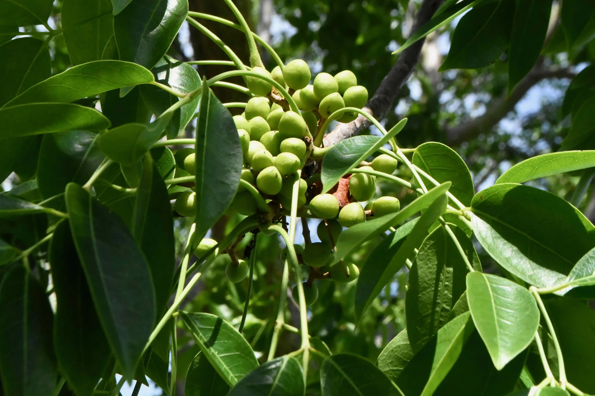 Poisonwood (Metopium toxiferum) is in the Anacardiaceae, the same family as mangos and poison ivy. These plants all produce urushiol – a substance that causes an oozing, itching rash. Rubbing against the leaves or bark can cause reactions in allergic individuals. If you are able to clean off the area (using a poison ivy cleaner like Tecnu, or gumbo limbo leaves, see below) a reaction may be avoided. One can even be “poisoned” by standing underneath the tree when raining.