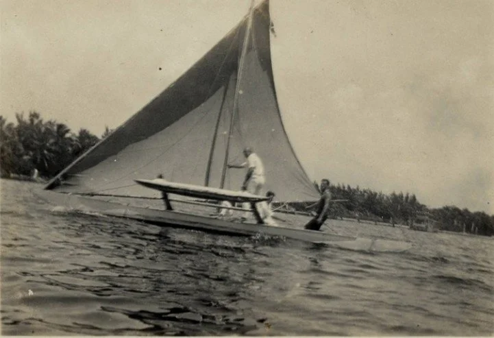 Figure 1. One of Ralph Munroe's proas. Notice how the arm, the aka, serves as a counterweight to the wind on the sail. Photo courtesy of the University of Miami Richter Library, Ralph M. Munroe Family Papers Collection.